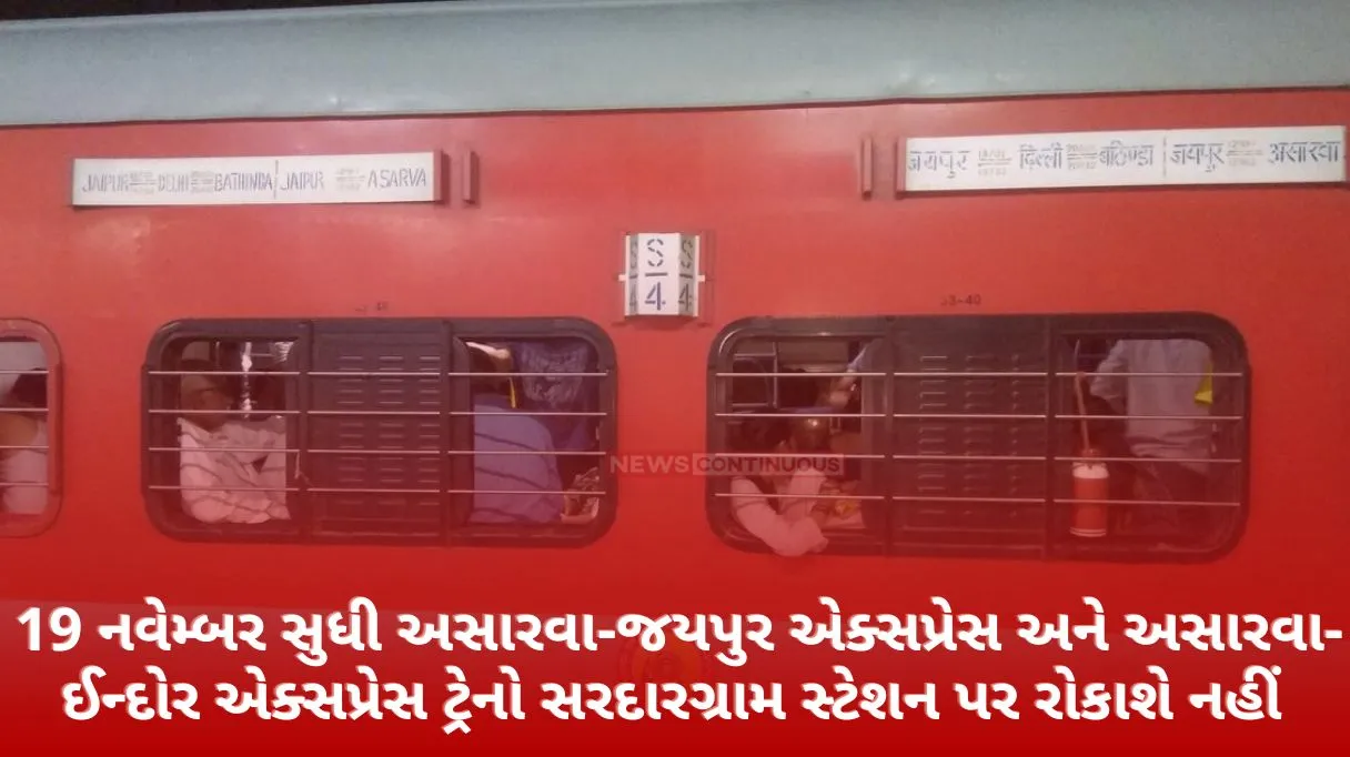 Express Train: પશ્ચિમ રેલવે ( Western Railway ) દ્વારા અસારવા-જયપુર એક્સપ્રેસ ( Asarva-Jaipur Express) અને અસારવા-ઈન્દોર એક્સપ્રેસ ટ્રેનોનું ( Asarva-Indore Express Trains ) સરદાર ગ્રામ સ્ટેશન ( Sardar Gram Station ) પર સ્ટોપેજ ( stoppage ) ટેક્નિકલ કારણોસર 19 નવેમ્બર 2023 સુધી અસ્થાયી રૂપે સ્થગિત કરવામાં આવ્યું છે. જે આ મુજબ છે: