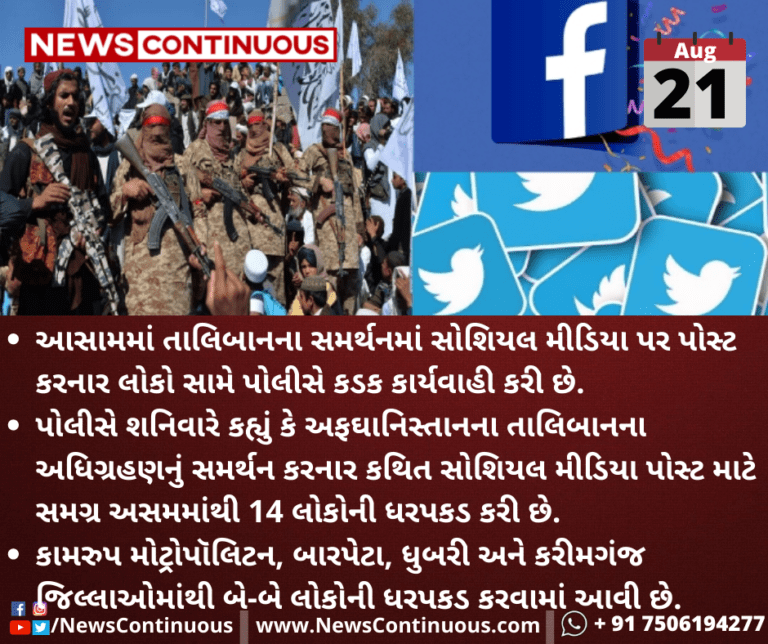 આસામમાં તાલિબાનના સમર્થનમાં સોશિયલ મીડિયા પર પોસ્ટ કરનાર લોકો સામે પોલીસે કડક કાર્યવાહી કરી છે.