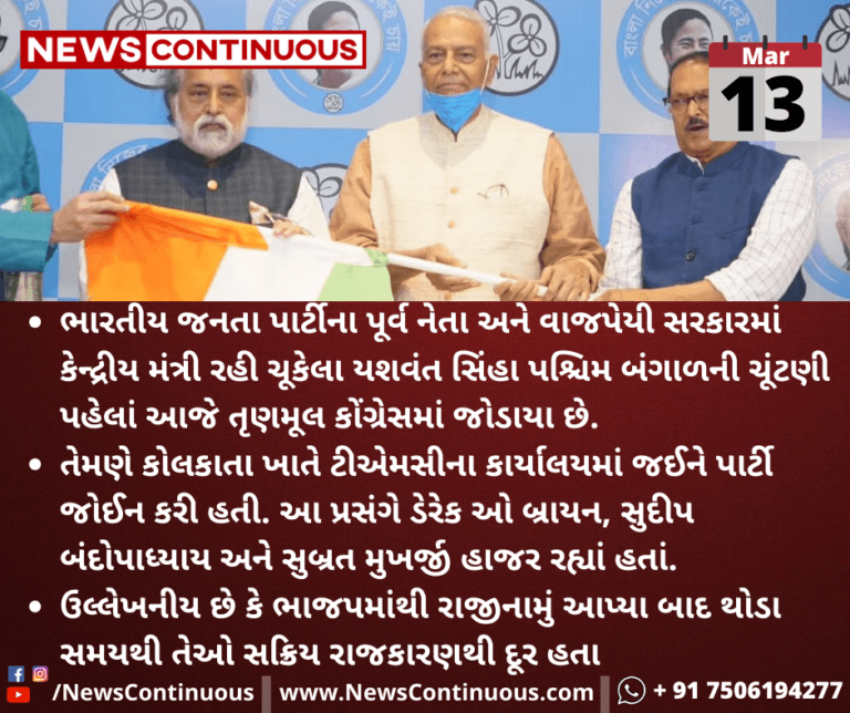 બંગાળમાં તૃણમૂલ કોંગ્રેસમાં ભારતીય જનતા પાર્ટીના પૂર્વ નેતા અને વાજપેયી સરકારમાં કેન્દ્રીય મંત્રી રહી ચૂકેલા યશવંત સિંહા પશ્ચિમ બંગાળની ચૂંટણી પહેલાં આજે તૃણમૂલ કોંગ્રેસમાં જોડાયા છે.