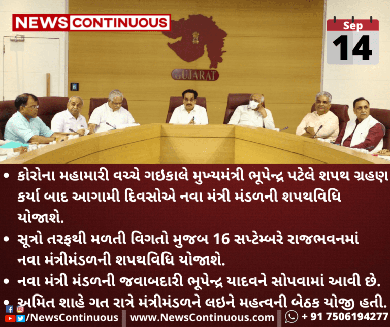 સૂત્રો તરફથી મળતી વિગતો મુજબ 16 સપ્ટેમ્બરે રાજભવનમાં નવા મંત્રીમંડળની શપથવિધિ યોજાશે.