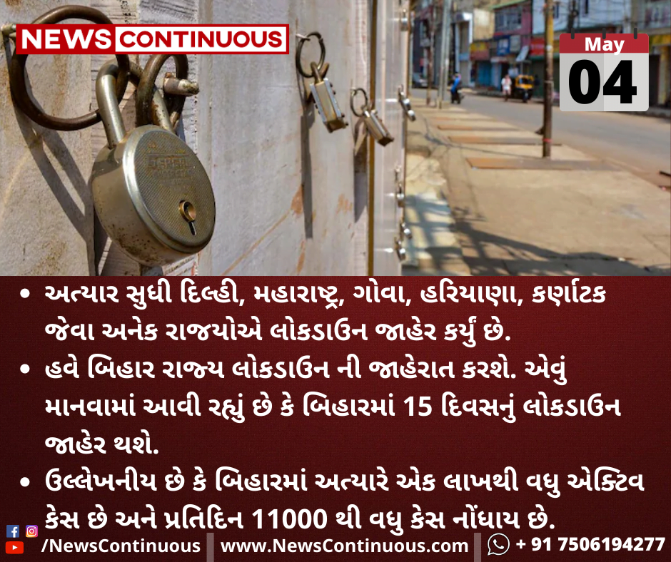 હવે બિહાર રાજ્ય લોકડાઉન ની જાહેરાત કરશે. એવું માનવામાં આવી રહ્યું છે કે બિહારમાં 15 દિવસનું લોકડાઉન જાહેર થશે.