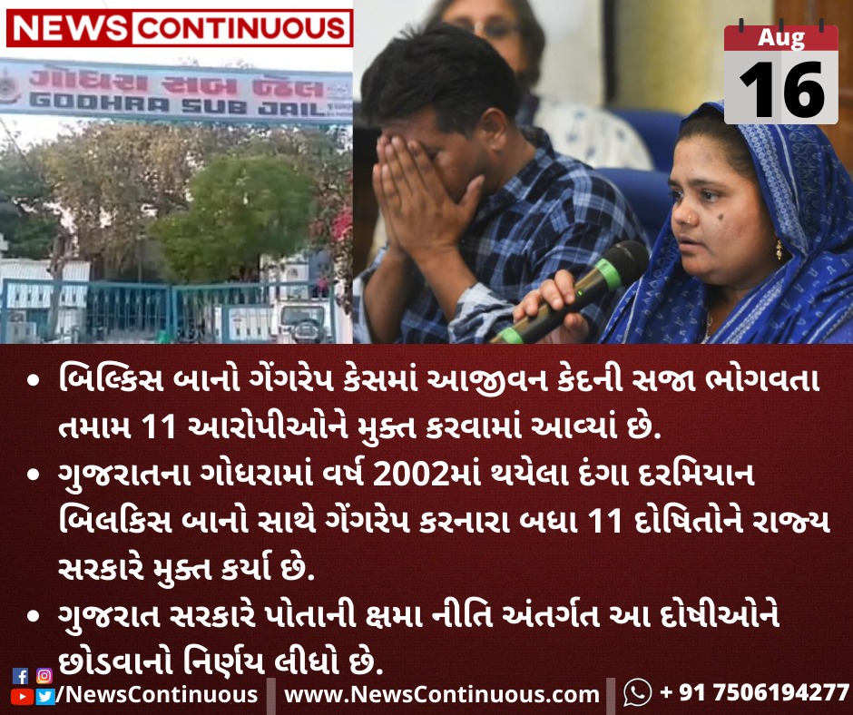 ગુજરાતના(Gujarat) ગોધરામાં(Godhra) વર્ષ 2002માં થયેલા દંગા દરમિયાન(During the riots) બિલકિસ બાનો સાથે ગેંગરેપ કરનારા બધા 11 દોષિતોને રાજ્ય સરકારે(State Govt) મુક્ત કર્યા છે.