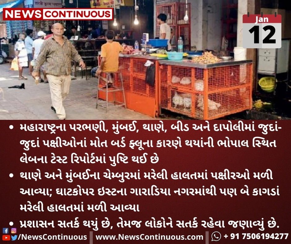 મહારાષ્ટ્રના પરભણી, મુંબઈ, થાણે, બીડ અને દાપોલીમાં જુદાં-જુદાં પક્ષીઓનાં મોત બર્ડ ફ્લૂના કારણે થયાંની ભોપાલ સ્થિત લેબના ટેસ્ટ રિપોર્ટમાં પુષ્ટિ થઈ છે.