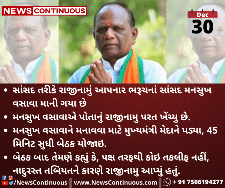 - સાંસદ તરીકે રાજીનામું આપનાર ભરૂચનાં સાંસદ મનસુખ વસાવા માની ગયા છે