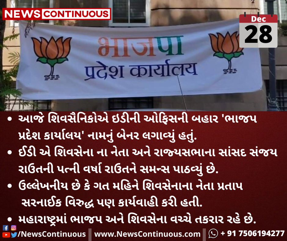- આજે શિવસૈનિકોએ ઇડીની ઓફિસની બહાર 'ભાજપ પ્રદેશ કાર્યાલય' નામનું બેનર લગાવ્યું હતું.