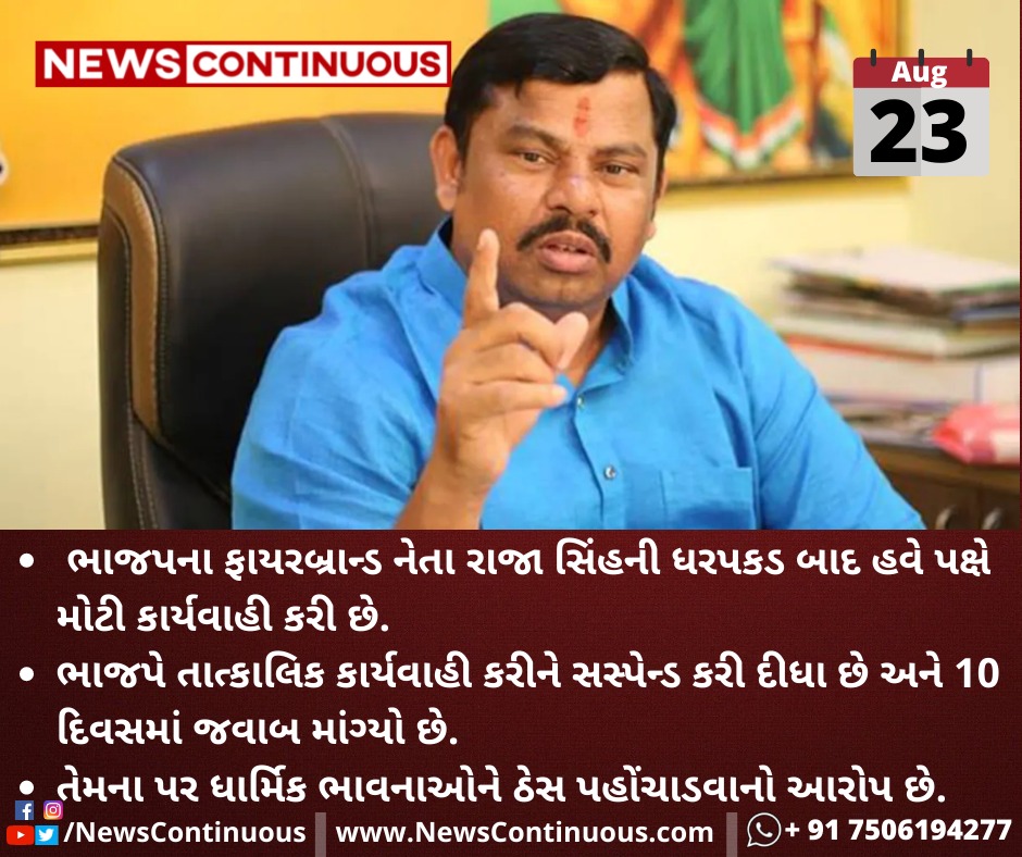ભાજપના(BJP) ફાયરબ્રાન્ડ નેતા રાજા સિંહની(Raja Singh) ધરપકડ બાદ હવે પક્ષે મોટી કાર્યવાહી કરી છે.