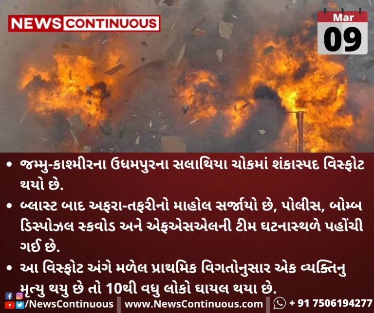 જમ્મુ-કાશ્મીરના ઉધમપુરના સલાથિયા ચોકમાં શંકાસ્પદ વિસ્ફોટ થયો છે.