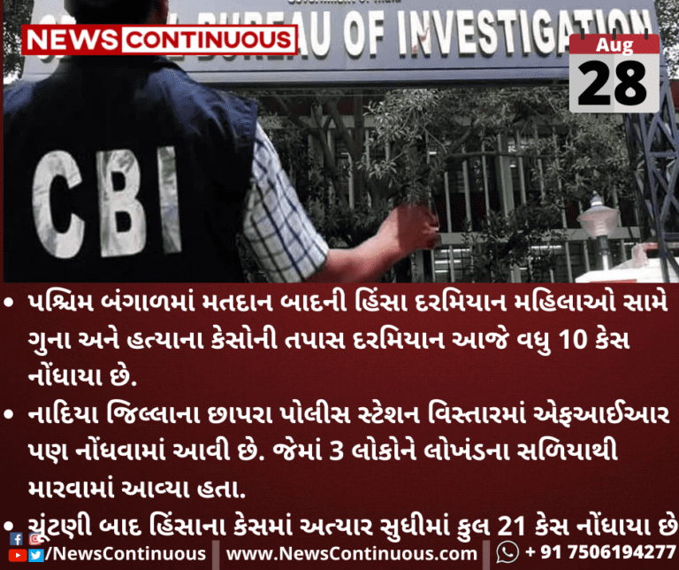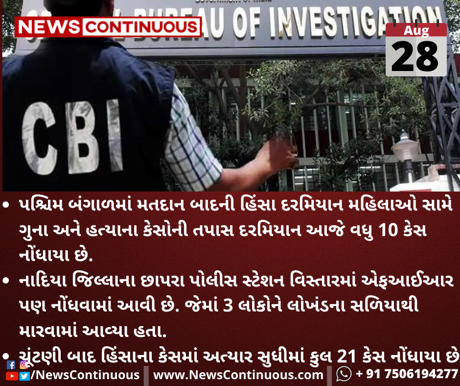 પશ્ચિમ બંગાળમાં મતદાન બાદની હિંસા દરમિયાન મહિલાઓ સામે ગુના અને હત્યાના કેસોની તપાસ દરમિયાન આજે વધુ 10 કેસ નોંધાયા છે.