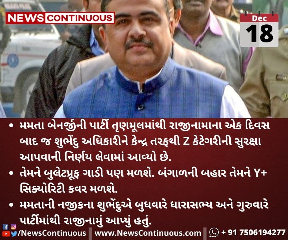 - મમતા બેનર્જીની પાર્ટી તૃણમૂલમાંથી રાજીનામાના એક દિવસ બાદ જ શુભેંદુ અધિકારીને કેન્દ્ર તરફથી Z કેટેગરીની સુરક્ષા આપવાની નિર્ણય લેવામાં આવ્યો છે.