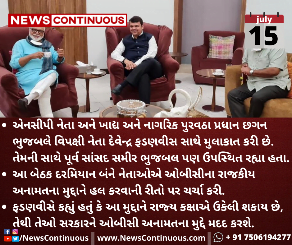એનસીપી નેતા અને ખાદ્ય અને નાગરિક પુરવઠા પ્રધાન છગન ભુજબલે વિપક્ષી નેતા દેવેન્દ્ર ફડણવીસ સાથે મુલાકાત કરી છે. તેમની સાથે પૂર્વ સાંસદ સમીર ભુજબલ પણ ઉપસ્થિત રહ્યા હતા.