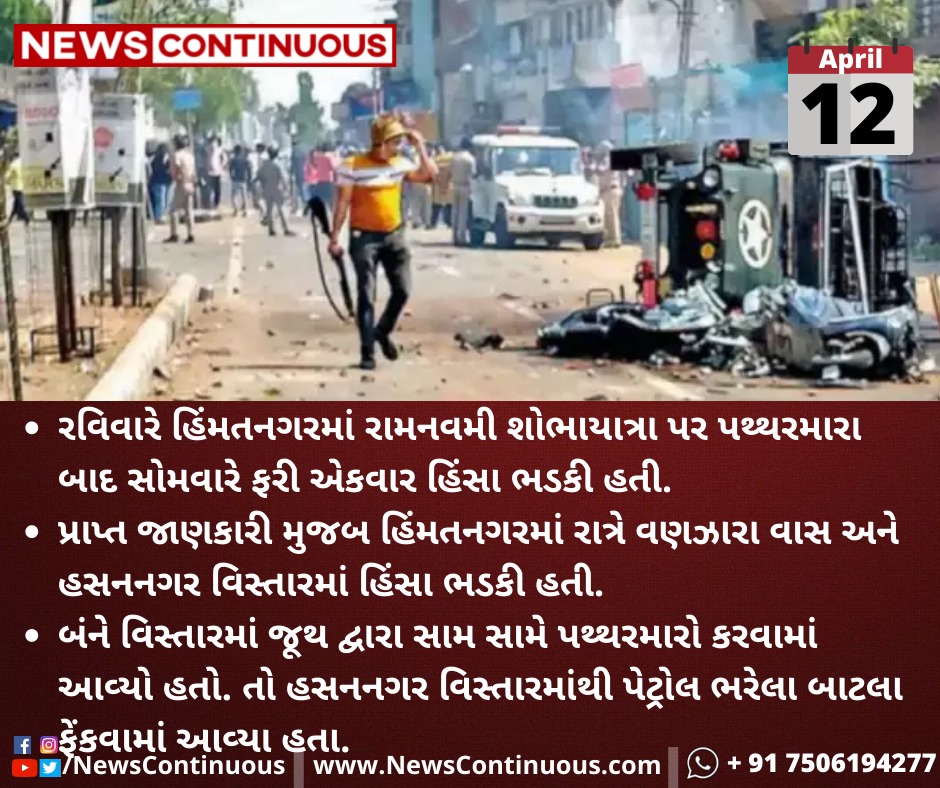 રવિવારે હિંમતનગરમાં રામનવમી શોભાયાત્રા પર પથ્થરમારા બાદ સોમવારે ફરી એકવાર હિંસા ભડકી હતી.
