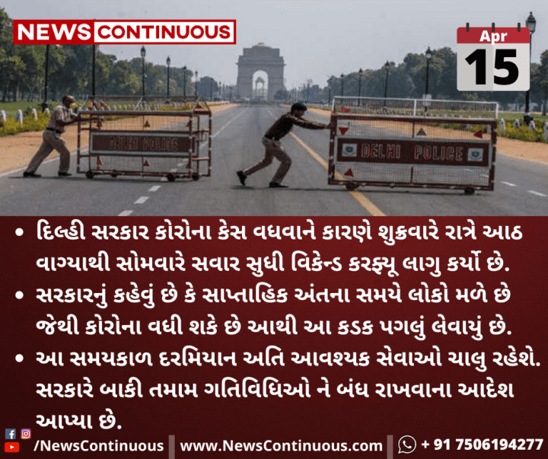 દિલ્હી સરકાર કોરોના કેસ વધવાને કારણે શુક્રવારે રાત્રે આઠ વાગ્યાથી સોમવારે સવાર સુધી વિકેન્ડ કરફ્યૂ લાગુ કર્યો છે.