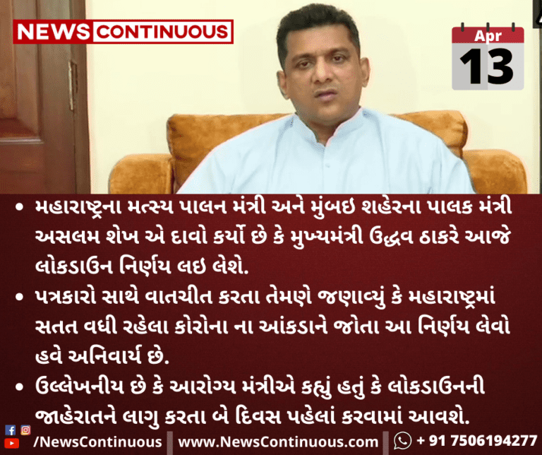 મહારાષ્ટ્રના મત્સ્ય પાલન મંત્રી અને મુંબઇ શહેરના પાલક મંત્રી અસલમ શેખ એ દાવો કર્યો છે કે મુખ્યમંત્રી ઉદ્ધવ ઠાકરે આજે લોકડાઉનનો નિર્ણય લઇ લેશે.