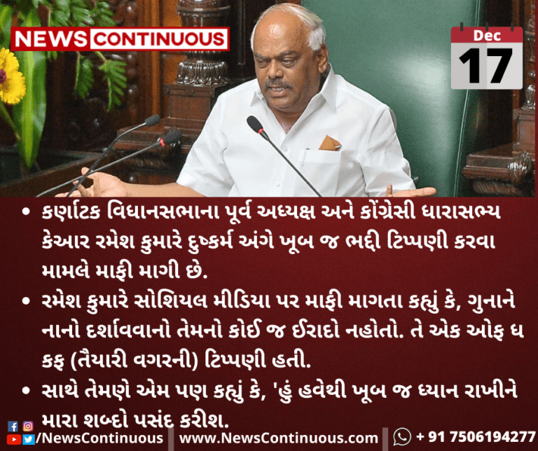કર્ણાટક વિધાનસભાના પૂર્વ અધ્યક્ષ અને કોંગ્રેસી ધારાસભ્ય કેઆર રમેશ કુમારે દુષ્કર્મ અંગે ખૂબ જ ભદ્દી ટિપ્પણી કરવા મામલે માફી માગી છે.