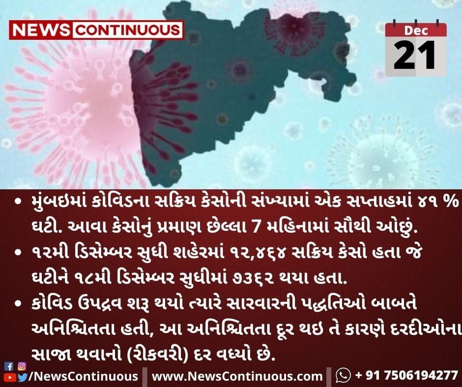 - મુંબઇમાં કોવિડના સક્રિય કેસોની સંખ્યામાં એક સપ્તાહમાં ૪૧ % ઘટી. આવા કેસોનું પ્રમાણ છેલ્લા 7 મહિનામાં સૌથી ઓછું.