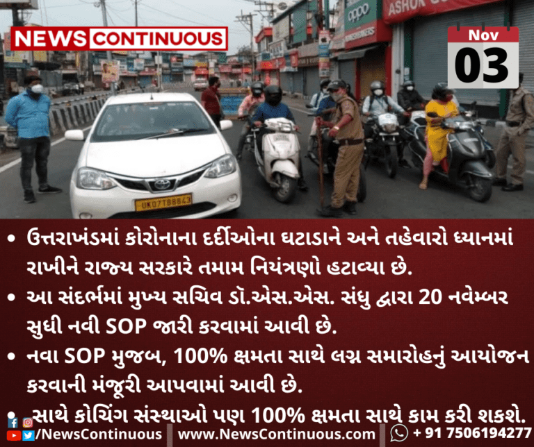 ઉત્તરાખંડમાં કોરોનાના દર્દીઓના ઘટાડાને અને તહેવારો ધ્યાનમાં રાખીને રાજ્ય સરકારે તમામ નિયંત્રણો હટાવ્યા છે.