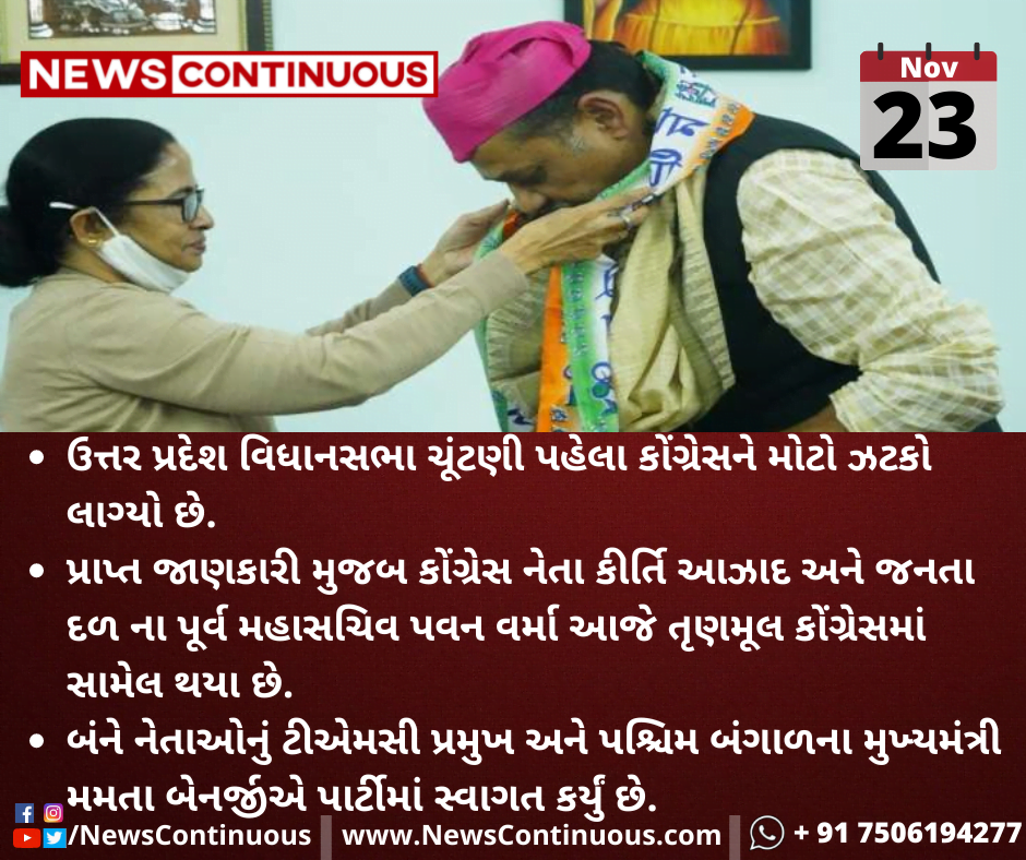 પ્રાપ્ત જાણકારી મુજબ કોંગ્રેસ નેતા કીર્તિ આઝાદ અને જનતા દળ ના પૂર્વ મહાસચિવ પવન વર્મા આજે તૃણમૂલ કોંગ્રેસમાં સામેલ થયા છે.
