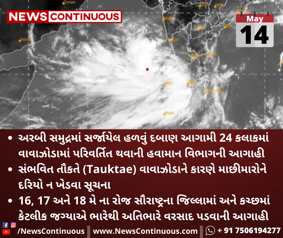અરબી સમુદ્રમાં સર્જાયેલ હળવું દબાણ આગામી 24 કલાકમાં વાવાઝોડામાં પરિવર્તિત થવાની હવામાન વિભાગની આગાહી