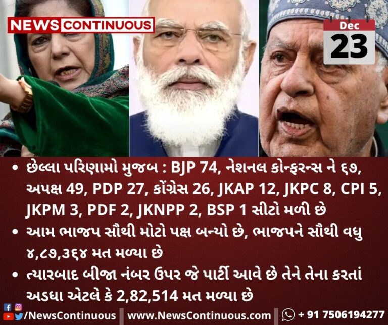 - છેલ્લા પરિણામો મુજબ : BJP 74, નેશનલ કોન્ફરન્સ ને ૬૭, અપક્ષ 49, PDP 27, કોંગ્રેસ 26, JKAP 12, JKPC 8, CPI 5, JKPM 3, PDF 2, JKNPP 2, BSP 1 સીટો મળી છે.