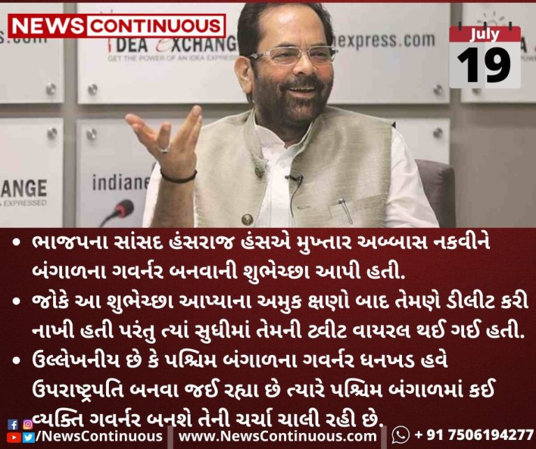 ભાજપ(BJP)ના સાંસદ(MP) હંસરાજ હંસ (Hansraj Hans)એ મુખ્તાર અબ્બાસ નકવી (Mukhtar Abbas Naqvi)ને બંગાળ(West Bengal)ના ગવર્નર(Governor) બનવાની શુભેચ્છા આપી હતી.