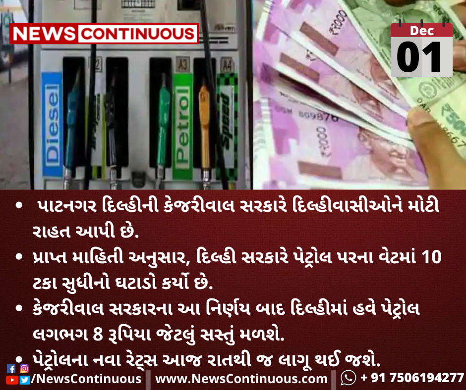 પ્રાપ્ત માહિતી અનુસાર, દિલ્હી સરકારે પેટ્રોલ પરના વેટમાં 10 ટકા સુધીનો ઘટાડો કર્યો છે.
