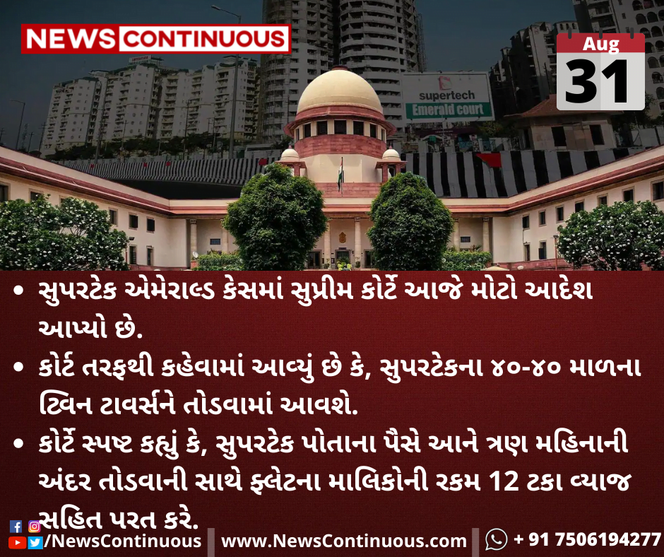 સુપરટેક એમેરાલ્ડ કેસમાં સુપ્રીમ કોર્ટે આજે મોટો આદેશ આપ્યો છે.