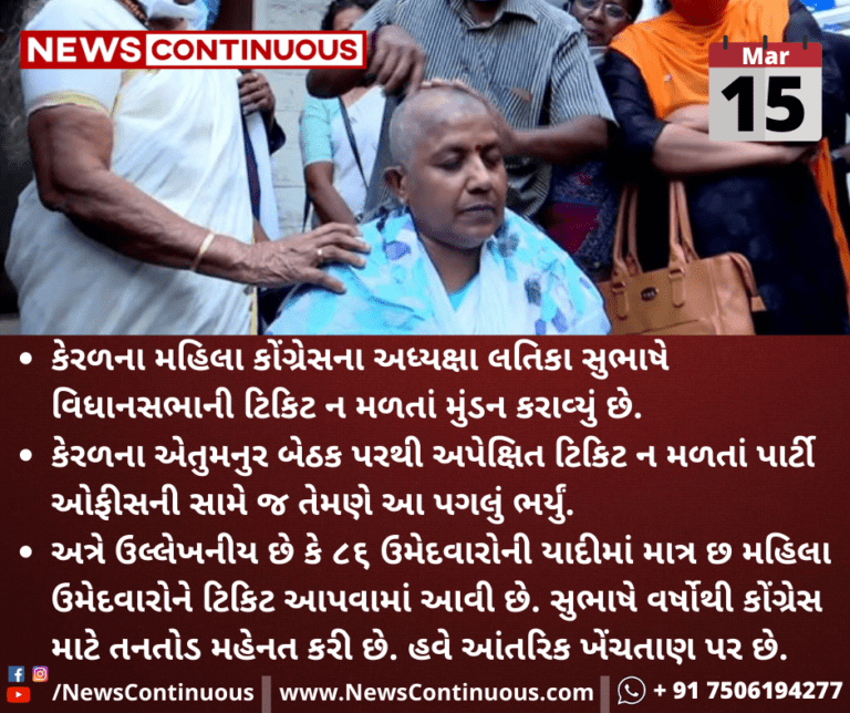 કેરળના મહિલા કોંગ્રેસના અધ્યક્ષા લતિકા સુભાષે વિધાનસભાની ટિકિટ ન મળતાં મુંડન કરાવ્યું છે.