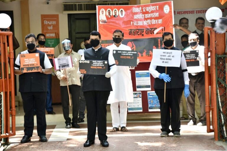 મહારાષ્ટ્ર સરકાર કોવિડ-19 રોકવામાં અસફળ, દેવેન્દ્ર ફડણવીસે વિરોધ પ્રદર્શન કરી 50,000 કરોડના પેકેજની માંગ કરી.