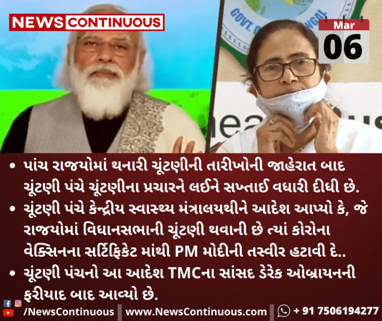 ચૂંટણી પંચે કેન્દ્રીય સ્વાસ્થ્ય મંત્રાલયથીને આદેશ આપ્યો કે, જે રાજયોમાં વિધાનસભાની ચૂંટણી થવાની છે ત્યાં કોરોના વેક્સિનના સર્ટિફિકેટ માંથી PM મોદીની તસ્વીર હટાવી દે..