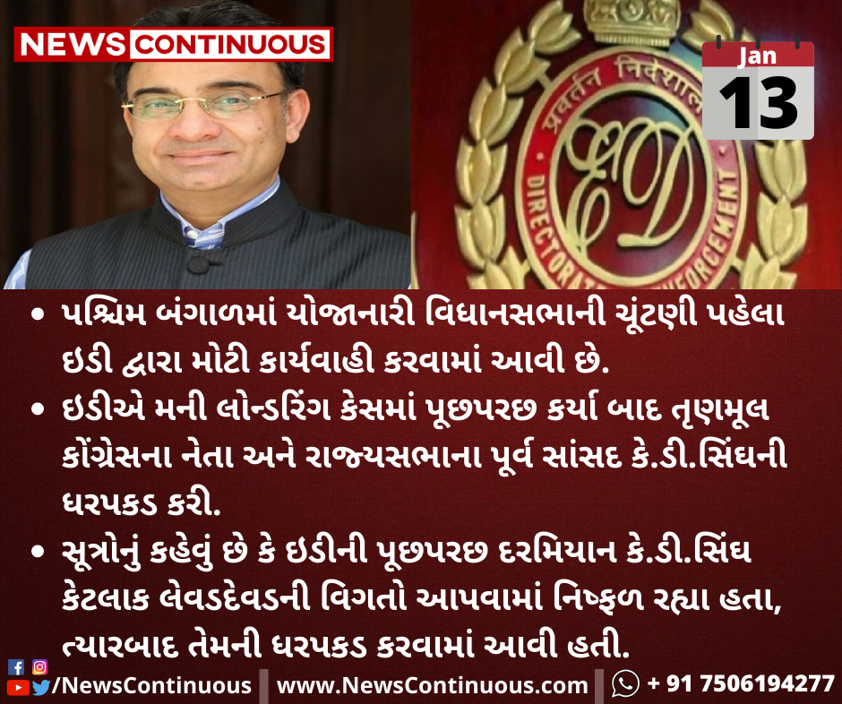 ઇડીએ મની લોન્ડરિંગ કેસમાં પૂછપરછ કર્યા બાદ તૃણમૂલ કોંગ્રેસના નેતા અને રાજ્યસભાના પૂર્વ સાંસદ કે.ડી.સિંઘની ધરપકડ કરી.