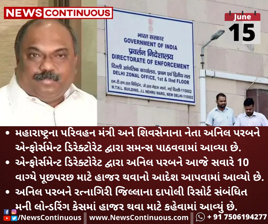 એન્ફોર્સમેન્ટ ડિરેક્ટોરેટ દ્વારા અનિલ પરબને આજે સવારે 10 વાગ્યે પૂછપરછ માટે હાજર થવાનો આદેશ આપવામાં આવ્યો છે