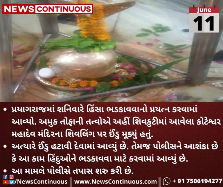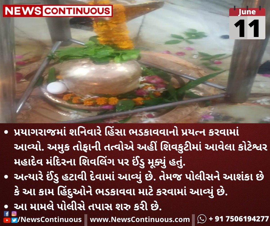 પ્રયાગરાજમાં(Prayagraj) શનિવારે હિંસા(Violence) ભડકાવવાનો પ્રયત્ન કરવામાં આવ્યો. અમુક તોફાની તત્વોએ અહીં શિવકુટીમાં(Shivkuti) આવેલા કોટેશ્વર મહાદેવ મંદિરના(Koteshwar Mahadev Temple) શિવલિંગ (Shivling) પર ઈંડુ(Egg) મૂક્યું હતું.