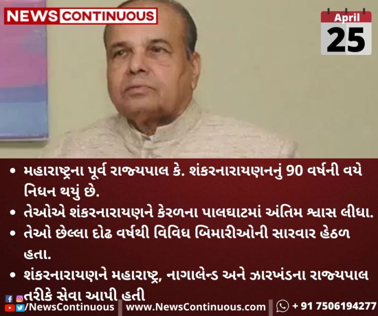 મહારાષ્ટ્રના(Maharashtra) પૂર્વ રાજ્યપાલ(Governor) કે. શંકરનારાયણનનું(K.Shankaranarayanan) 90 વર્ષની વયે નિધન થયું છે.