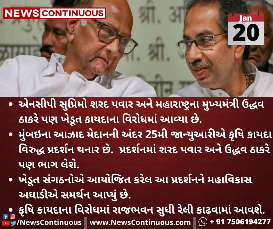 મુંબઇના આઝાદ મેદાનની અંદર 25મી જાન્યુઆરીએ કૃષિ કાયદા વિરુદ્ધ પ્રદર્શન થનાર છે. પ્રદર્શનમાં શરદ પવાર અને ઉદ્ધવ ઠાકરે પણ ભાગ લેશે.