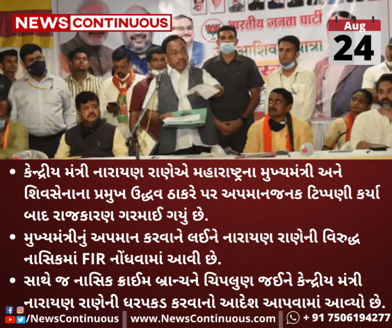 મુખ્યમંત્રીનું અપમાન કરવાને લઈને નારાયણ રાણેની વિરુદ્ધ નાસિકમાં FIR નોંધવામાં આવી છે.