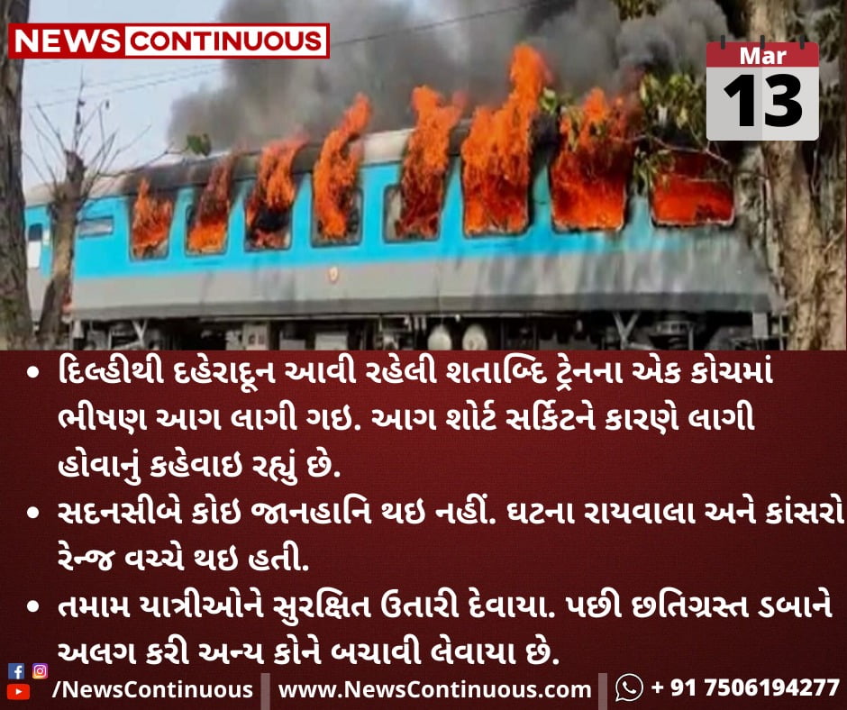દિલ્હીથી દહેરાદૂન આવી રહેલી શતાબ્દિ ટ્રેનના એક કોચમાં ભીષણ આગ લાગી ગઇ. આગ શોર્ટ સર્કિટને કારણે લાગી હોવાનું કહેવાઇ રહ્યું છે.