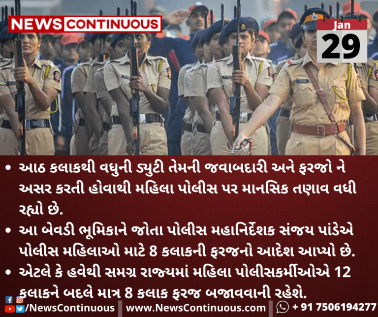 એટલે કે હવેથી સમગ્ર રાજ્યમાં મહિલા પોલીસકર્મીઓએ 12 કલાકને બદલે માત્ર 8 કલાક ફરજ બજાવવાની રહેશે.