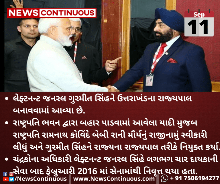 લેફ્ટનન્ટ જનરલ ગુરમીત સિંહને ઉત્તરાખંડના રાજ્યપાલ બનાવવામાં આવ્યા છે.