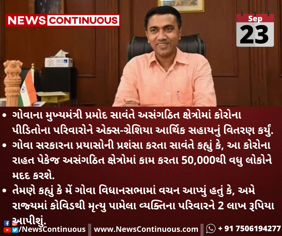 ગોવાના મુખ્યમંત્રી પ્રમોદ સાવંતે અસંગઠિત ક્ષેત્રોમાં કોરોના પીડિતોના પરિવારોને એક્સ-ગ્રેશિયા આર્થિક સહાયનું વિતરણ કર્યું.