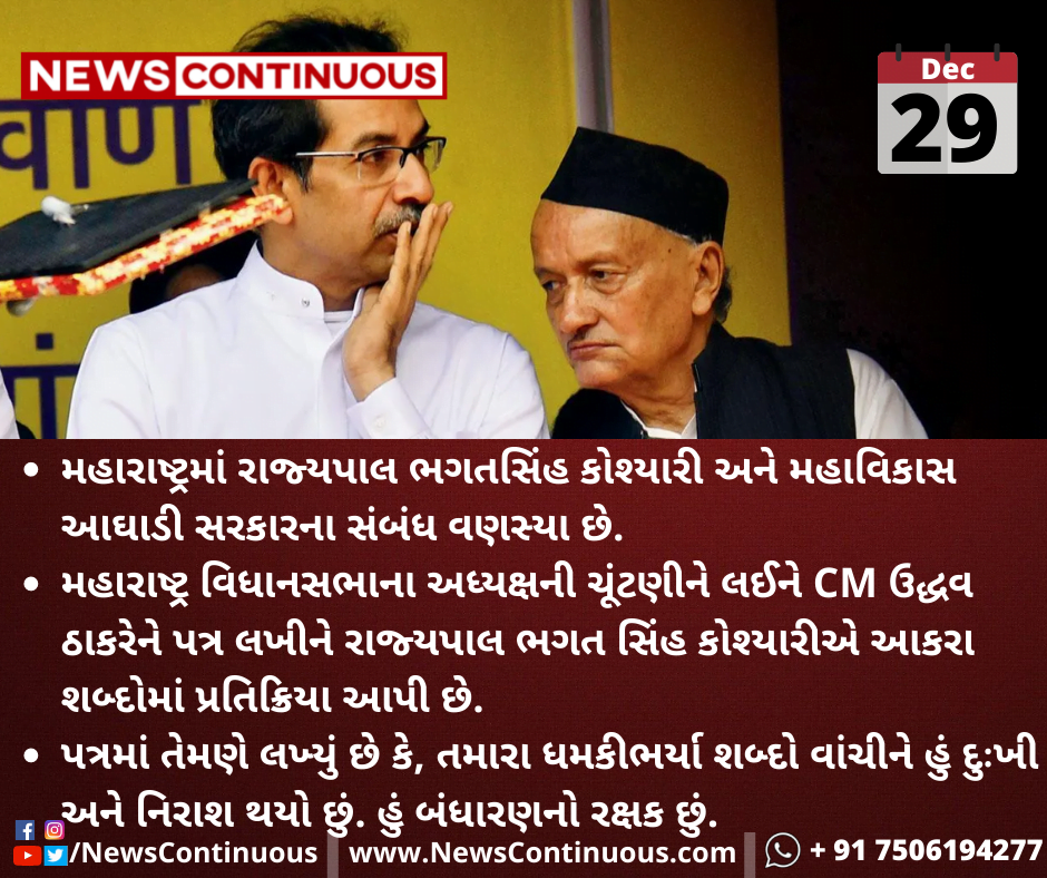 મહારાષ્ટ્રમાં રાજ્યપાલ ભગતસિંહ કોશ્યારી અને મહાવિકાસ આઘાડી સરકારના સંબંધ વણસ્યા છે.