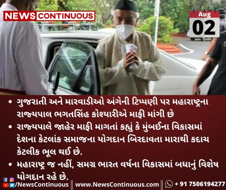 રાજ્યપાલે જાહેર માફી માગતાં કહ્યું કે મુંબઈ(Mumbai)ના વિકાસમાં દેશના કેટલાંક સમાજના યોગદાન બિરદાવતા મારાથી કદાચ કેટલીક ભૂલ થઈ છે.