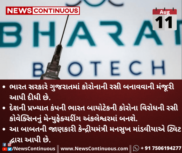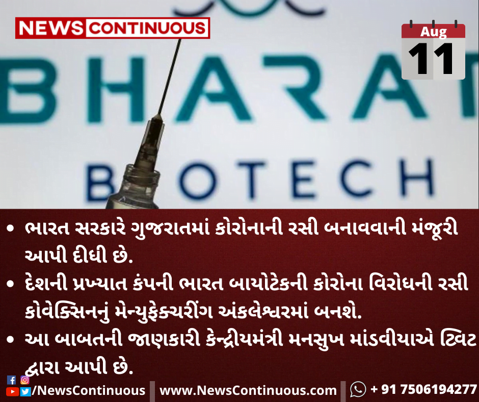 દેશની પ્રખ્યાત કંપની ભારત બાયોટેકની કોરોના વિરોધની રસી કોવેક્સિનનું મેન્યુફેક્ચરીંગ અંકલેશ્વરમાં બનશે.