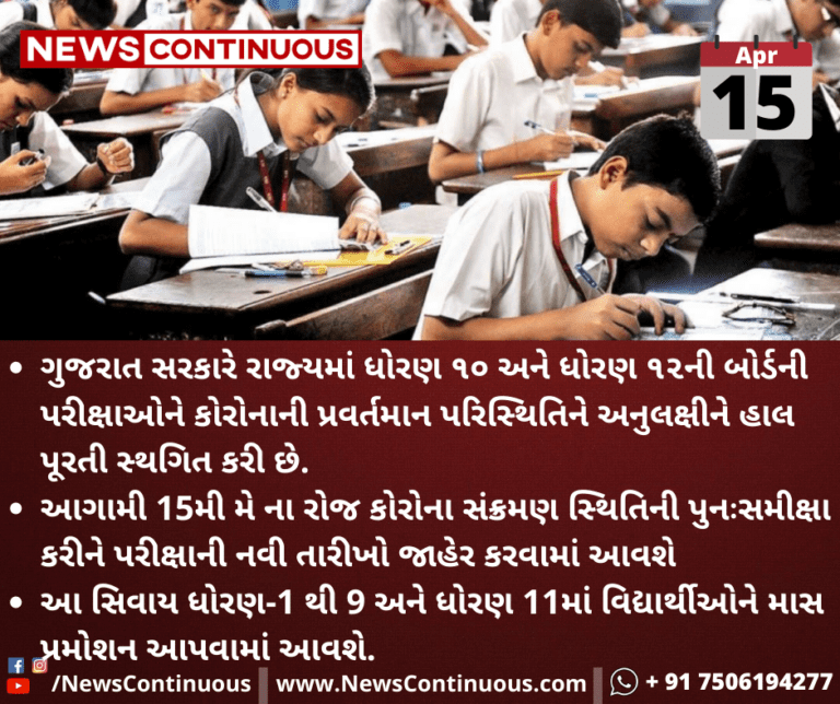 ગુજરાત સરકારે રાજ્યમાં ધોરણ ૧૦ અને ધોરણ ૧૨ની બોર્ડની પરીક્ષાઓને કોરોનાની પ્રવર્તમાન પરિસ્થિતિને અનુલક્ષીને હાલ પૂરતી સ્થગિત કરી છે.