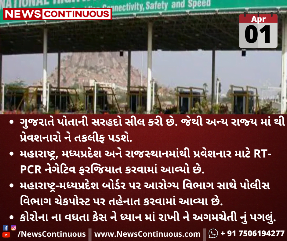 - ગુજરાતે પોતાની સરહદો સીલ કરી છે. જેથી અન્ય રાજ્ય માં થી પ્રેવશનારો ને તકલીફ પડશે.