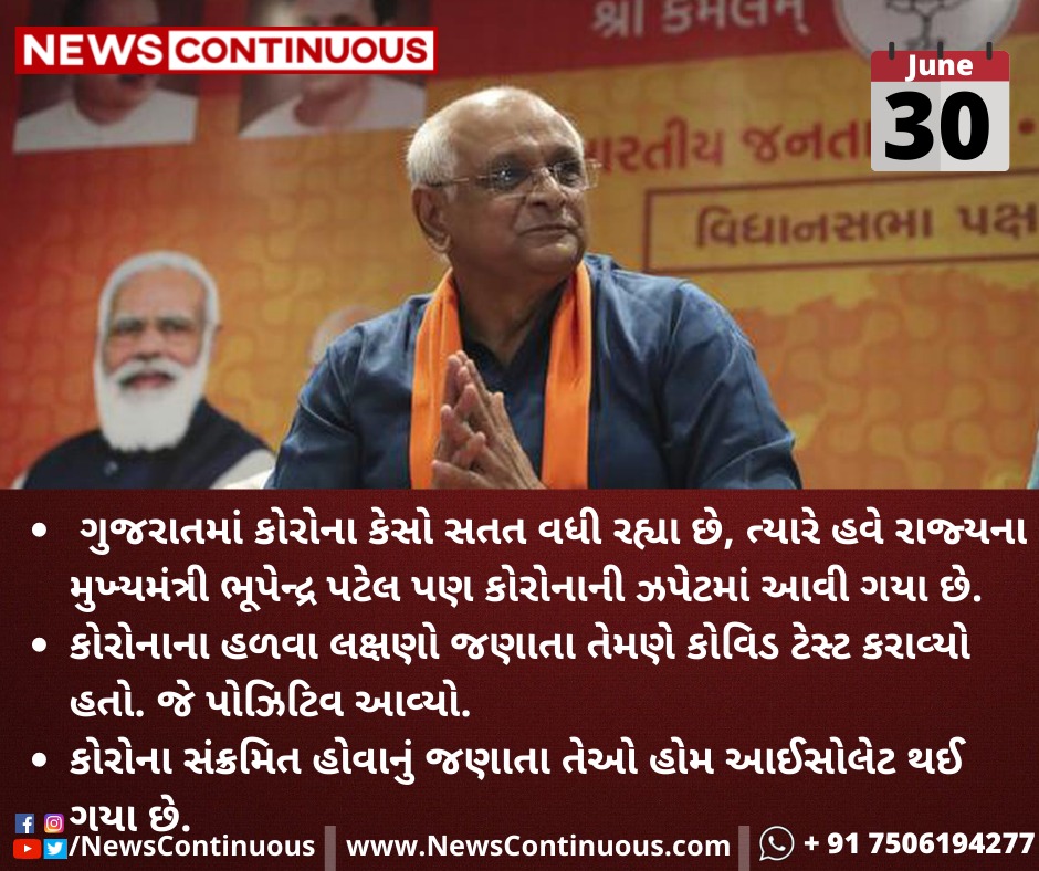 ગુજરાત(Gujarat)માં કોરોના(Covid cases) કેસો સતત વધી રહ્યા છે, ત્યારે હવે રાજ્યના મુખ્યમંત્રી(CM) ભૂપેન્દ્ર પટેલ(Bhupendra Patel) પણ કોરોનાની ઝપેટમાં આવી ગયા છે.