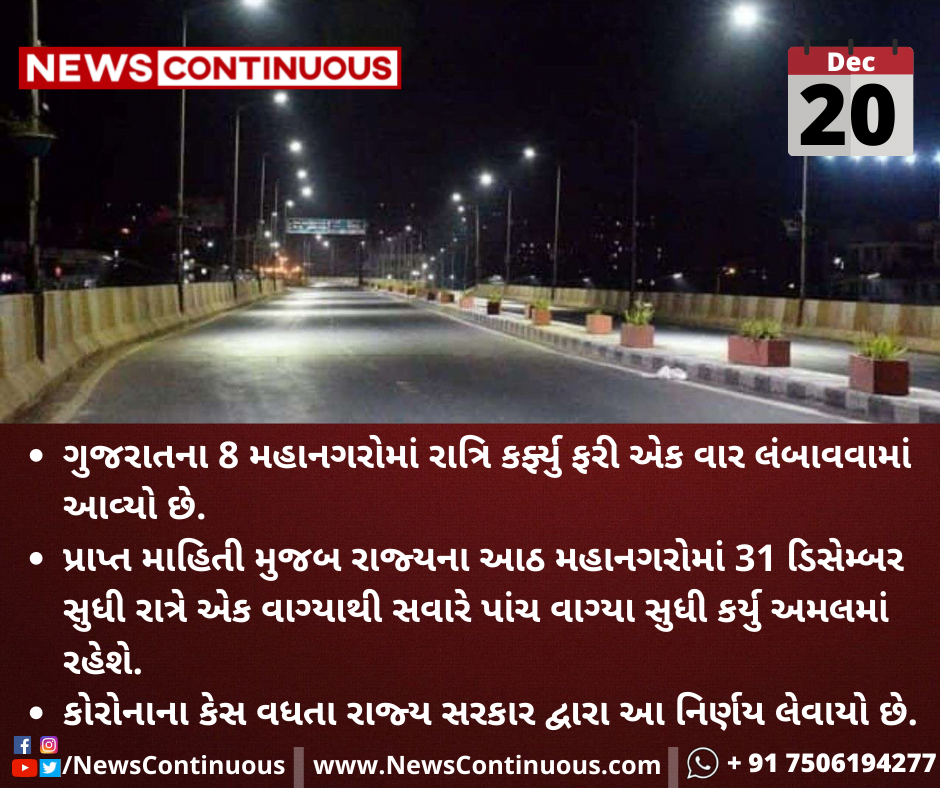 ગુજરાતના 8 મહાનગરોમાં રાત્રિ કર્ફ્યુ ફરી એક વાર લંબાવવામાં આવ્યો છે.