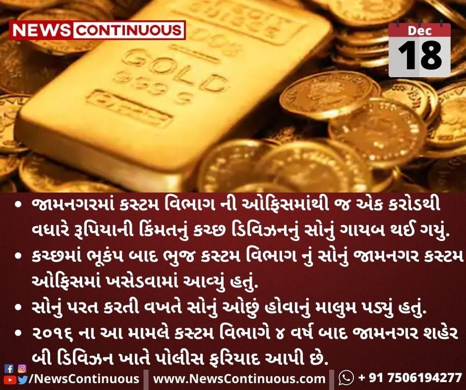 - જામનગરમાં કસ્ટમ વિભાગ ની ઓફિસમાંથી જ એક કરોડથી વધારે રૂપિયાની કિંમતનું કચ્છ ડિવિઝનનું સોનું ગાયબ થઈ ગયું.