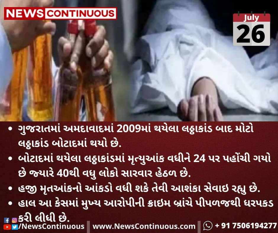 ગુજરાતમાં અમદાવાદમાં 2009માં થયેલા લઠ્ઠાકાંડ બાદ મોટો લઠ્ઠાકાંડ બોટાદમાં થયો છે.