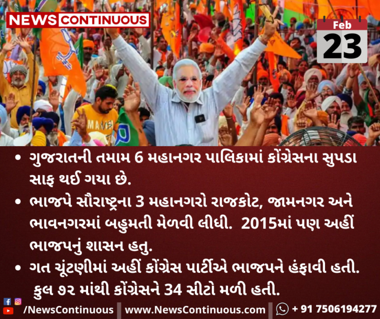 ગુજરાતની તમામ 6 મહાનગર પાલિકામાં કોંગ્રેસના સુપડા સાફ થઈ ગયા છે.