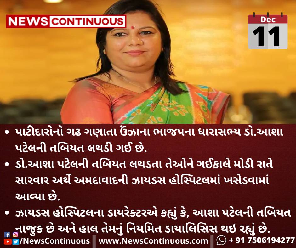 પાટીદારોનો ગઢ ગણાતા ઉંઝાના ભાજપના ધારાસભ્ય ડો.આશા પટેલની તબિયત લથડી ગઈ છે.